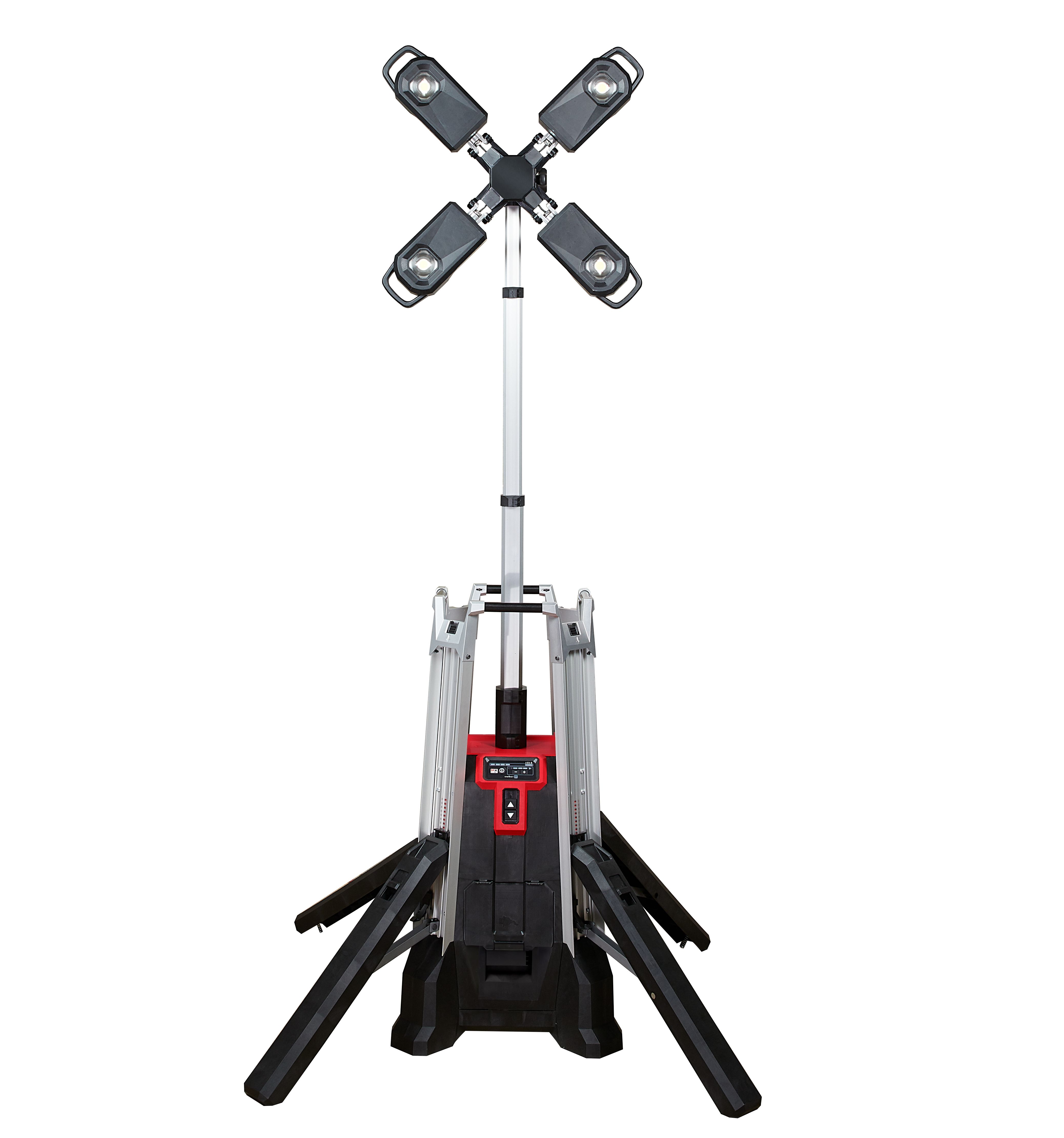 MX FUEL™ 塔灯 | MXF TL MX FUEL™ 塔灯提供TRUEVIEW™ 高清照明,交流电模式下可提供高达27,000 流明,直流电模式下可提供高达20,000 流明,四个多方向LED 灯头使用家能够将光线定向到工作或区域照明所需的位置。 MX FUEL™ 塔灯亦十分适合户外使用,4 个支撑腿使塔灯能够承受风暴和高达55 公里/小时的风速,IP55 防护等级(直流电模式下),20 厘米的全地形车轮使用家能够轻松地在整个施工现场移动,手柄可让起重机进行吊装。